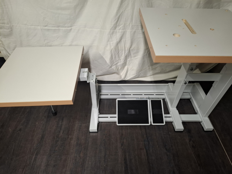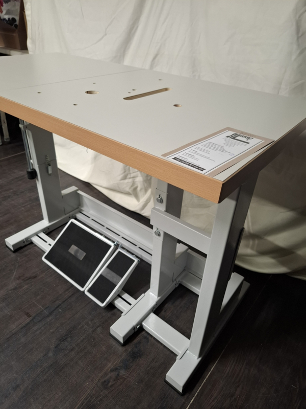 Het deelbare tafelblad is geschikt voor industriële naaimachines met vrije arm van diverse merken. De openklapbare tafel bied veel ruimte voor grote projecten en het open gedeelte kan dienen als werktafel. , waardoor het ideaal is voor het maken van handtassen, marokijnwaren, koffers, ect. Inclusief een lade en één grote en kleine pedaal.